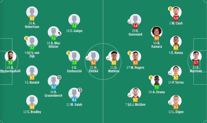 在北京时间11月2日结束的英超第10轮一场焦点战中,卫冕冠军利物浦在主场2-0力挫阿斯顿维拉。上半场,罗杰斯中柱,埃基蒂克进球被吹,补时阶段大马丁低级失误,萨拉赫收大礼破僵。下半场,麦卡助攻赫拉芬贝赫锁定胜局。利物浦终结英超4连败,取得了近8场比赛的第2场胜利,近11场首次零封。10轮后积18分,暂时升至积分榜第3位。而维拉英超4连胜被终结,10轮积分15分。【关键焦点】半场补时第1分钟,马丁内斯开球失误,萨拉赫断球后推射实现连场破门,利物浦1-0领先维拉。这是萨拉赫利物浦生涯第250球,成为队史第三位达成这一里程碑的球员,前两位分别是伊恩-拉什(346球)和罗杰-亨特(285球)。第57分钟,保·托雷斯长传失误,利物浦中场地面传导,赫拉芬贝赫接球正面起脚远射,皮球变向入网,利物浦2-0领先维拉。【精彩回放】开场仅5分钟,维拉险些破门。罗杰斯禁区边缘劲射打远角,皮球击中立柱。第14分钟,索博斯洛伊远距离起脚劲射,皮球偏出球门。第18分钟,卡什禁区外突施冷箭皮球直奔死角,马马尔达什维利飞身扑出。第21分钟,罗杰斯再尝试一脚远射,马马尔达什维利再次将球扑出。第22分钟,索博斯洛伊前场断球,起脚推射被大马丁没收。第33分钟,索博斯洛伊主罚任意球,直接打门被大马丁扑出。第42分钟,埃基蒂克中路高高跃起,头球顶进球门被判罚越位。易边再战,第53分钟,萨拉赫头球摆渡布拉德利凌空抽射被扑,裁判吹罚萨拉赫越位。第70分钟,马伦禁区外张弓搭箭,大力射门稍稍偏出立柱。第74分钟,麦卡利斯特与奥纳纳互相推搡后倒地,裁判叫停比赛。【数据统计】【球员评分】【出场阵容】利物浦首发:25-马马尔达什维利、4-范戴克、5-科纳特、12-布拉德利、26-罗伯逊、8-索博斯洛伊、10-麦卡利斯特、38-赫拉芬贝赫、11-萨拉赫、18-加克波、22-埃基蒂克(77'7-维尔茨)替补未出场:28-伍德曼、41-阿尔明·佩奇、2-戈麦斯、6-凯尔凯兹、3-远藤航、42-尼奥尼、14-基耶萨、73-恩古莫哈阿斯顿维拉首发:23-马丁内斯、2-卡什、4-孔萨、14-保·托雷斯(74'5-明斯)、12-迪涅(74'22-马特森)、24-阿马杜·奥纳纳、44-布巴卡尔·卡马拉、7-麦金(59'6-巴克利)、29-盖桑(59'17-马伦)、27-罗杰斯、11-沃特金斯(74'19-桑乔)替补未出场:40-比佐特、3-林德洛夫、26-博加德、62-布罗乔