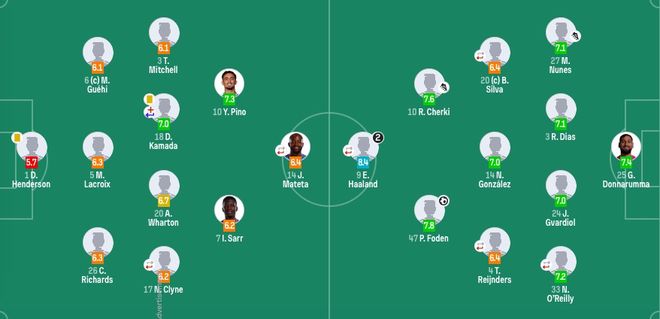 在北京时间12月14日晚结束的英超第16轮一场焦点战中,曼城在客场3-0力挫水晶宫。上半场,皮诺失单刀,福登任意球造险,哈兰德头槌打破僵局。下半场,沃顿中柱,福登贴地斩扩大优势,萨维尼奥造点,哈兰德主罚命中锁定胜局。曼城各项赛事豪取5连胜,其中英超4连胜后,16轮战罢积34分,继续以2分之差紧咬领头羊阿森纳。而水晶宫各项赛事3连胜终结,16轮后积26分,依然位居第5位。【关键焦点】第41分钟,B席右路回做,努内斯斜传送到禁区后点,哈兰德拍马赶到头球攻门得手,曼城1-0水晶宫。第69分钟,谢尔基分球,福登禁区前沿左脚贴地斩破门,曼城2-0水晶宫。最近4轮英超,福登贡献了6球1助的耀眼数据。第88分钟,萨维尼奥单刀被扑倒造点,哈兰德主罚命中,本场梅开二度。曼城3-0锁定胜局。哈兰德本赛季英超16轮17球,这也是他英超生涯的第102球,追平了勒蒂西耶,距离C罗的103球和德罗巴的104球,近在咫尺。【精彩回放】第17分钟,亚当·沃顿中圈送出过顶传球,皮诺前插获得单刀机会,结果他的射门击中横梁弹出。曼城逃过一劫。第23分钟,谢尔基送出过顶传球,赖因德斯禁区内射门没有踢到。第29分钟,曼城前场任意球机会,福登主罚直接攻门,亨德森飞身将球扑出。第34分钟,沃顿直塞,萨尔单刀小角度打门偏出。第43分钟,马特塔门前绝佳机会,多纳鲁马果断出击,抢在马特塔身前将球破坏。易边再战,第48分钟,尼科后场失误被断球,沃顿左脚抽射击中立柱,曼城再次逃过一劫。第57分钟,曼城断球后反击,赖因德斯突入禁区打门被亨德森扑出。第83分钟,恩凯蒂亚突入禁区小角度抽射,多纳鲁马扑出。【球员评分】【数据统计】【出场阵容】曼城首发:25-多纳鲁马、27-努内斯、3-鲁本·迪亚斯、24-格瓦迪奥尔、33-奥赖利(91'21-努里)、14-尼科、20-B席(91'82-刘易斯)、4-赖因德斯(85'26-萨维尼奥)、47-福登、10-谢尔基、9-哈兰德(91'7-马尔穆什)替补未出场:1-特拉福德、6-阿克、45-胡桑诺夫、52-鲍勃、63-穆卡萨水晶宫首发:1-亨德森、17-克莱因(77'12-乌切)、26-理查兹、5-拉克鲁瓦、6-格伊、3-米切尔、20-沃顿、18-镰田大地(67'19-休斯)、10-皮诺、7-伊斯梅拉-萨尔、14-马特塔(63'9-恩凯蒂亚)替补未出场:44-贝尼特斯、8-莱尔马、21-埃塞、23-坎沃、24-索萨、55-德文尼