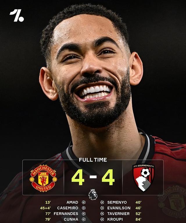 这仿佛不是一场足球比赛,更像一部狗血剧,中间还穿插了几段悬疑片和喜剧小品。老特拉福德凌晨上演的剧情,或许不能简单地用精彩来形容了,只能用这两个字概括:抽象。是的,我们或许见证了本赛季英超至今最抽象的一场比赛!北京时间12月16日4点,25-26赛季英超第16轮,曼联坐镇主场迎战伯恩茅斯。面对正处中下游的樱桃军团,阿莫林派上了库尼亚单箭头,身后是姆伯莫和芒特。后防线有所轮换,约罗、艾登-海文和卢克-肖搭档三中卫,为这场比赛的抽象埋下了伏笔!开场13分钟,曼联先声夺人,阿玛德头球破门,球迷以为这把稳了,开局如此美妙,1-0!第40分钟,卢克-肖一个漫不经心的回传失误,直接把球喂到塞梅尼奥脚下,对方笑纳大礼,1-1!此时的老特拉福德,瞬间多了一点熟悉的味道:这味儿,很曼联!上半场补时第4分钟,B费站了出来。他用一记精准角球找到了卡塞米罗,巴西人一记头球砸进去,2-1!带着领先回到更衣室,看上去一切都在按正常剧本走, 但足球的魅力就在于——只要你敢领先,对手就敢扳平!下半场刚开场,第46分钟,塔韦尼耶直塞助攻埃瓦尼尔森破门,比分改写为2-2!第52分钟,塔韦尼耶面对曼联这稀松的人墙,一记任意球直接破门,2-3!短短6分钟,比分从2-1变成2-3,曼联用实际行动诠释了:后防线?不存在的!第77分钟,B费站在任意球前,一脚势大力沉的射门直挂死角,3-3,老特拉福德沸腾了!紧接着第79分钟,库尼亚得球低射得分,曼联再度领先,4-3!这时候,如果是其它球队,正常的操作应该是:收紧防线稳守反击,争取拿下3分。但根据过往经验来看,曼联显然不喜欢正常这两个字!第84分钟,曼联后场被断,伯恩茅斯反击,克鲁皮推射破门,4-4!最后补时阶段,拉门斯站了出来连续两次拒绝对方攻门,硬是把比分锁死!全场战罢,曼联主场4-4上演进球大战收获平局,近5次对阵伯恩茅斯3平2负难求一胜,B费传射当选MVP。假如门前站着的是奥纳纳,这场比赛很可能是变成曼联领先过3次,但最后被对手绝杀的尴尬剧情……8球大战,曼联三度领先却被扳平,如此跌宕起伏或许正是英超最迷人的地方。从数据上看,两队合计轰出39脚射门,还有多达27次任意球!其中,曼联的控球率为56%,射门25次,进攻端可谓火力全开,如果你只看了进球集锦,会以为曼联仿佛重回巅峰。但只要多观察下防守,就会发现后防线问题不少:配合不佳漏洞频出,中后场防守脱节,简直像是临时从当地五人制球场拉来的!不只是曼联的后防线,本场的主裁判西蒙-胡珀,同样是抽象比赛的重要参与者。无论是开场2分钟,B费射门反弹击中对方球员手部,还是第25分钟对方球员争顶时疑似手球,上半场补时对方球员有疑似手球,主裁判均不认为有啥问题!这场4-4进球大战,对曼联来说可谓是3分变1分的痛失好局,16轮积26分位列英超第6,暂以净胜球优势高过死敌利物浦。你可以说球员上头防守不佳,但又不得不承认,这样的比赛确实足够精彩,因为:你永远猜不到下一秒会到底发生什么!正如卡拉格赛后锐评,「我认为我们刚刚见证了这赛季英超联赛最好的一场比赛。」阿莫林接受采访时说,「对于在家里的每个人来说,这都是场有意思的比赛。」无论你是哪队球迷,这场比赛或许足以让你记住很久,就像是买了一张票却连续玩了两次过山车。在当今世界足坛,时不时能把一场英超比赛踢得像喜剧片的球队,可能也就只有曼联了!