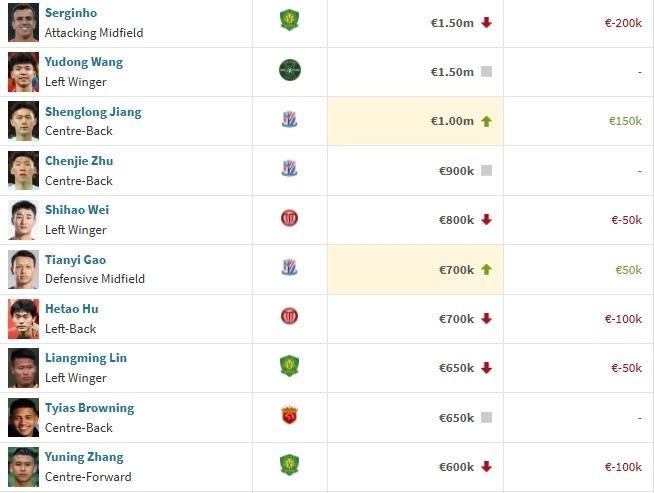 中超身价更新:3国脚破百万19岁王钰栋150万欧最高武磊跌至50万